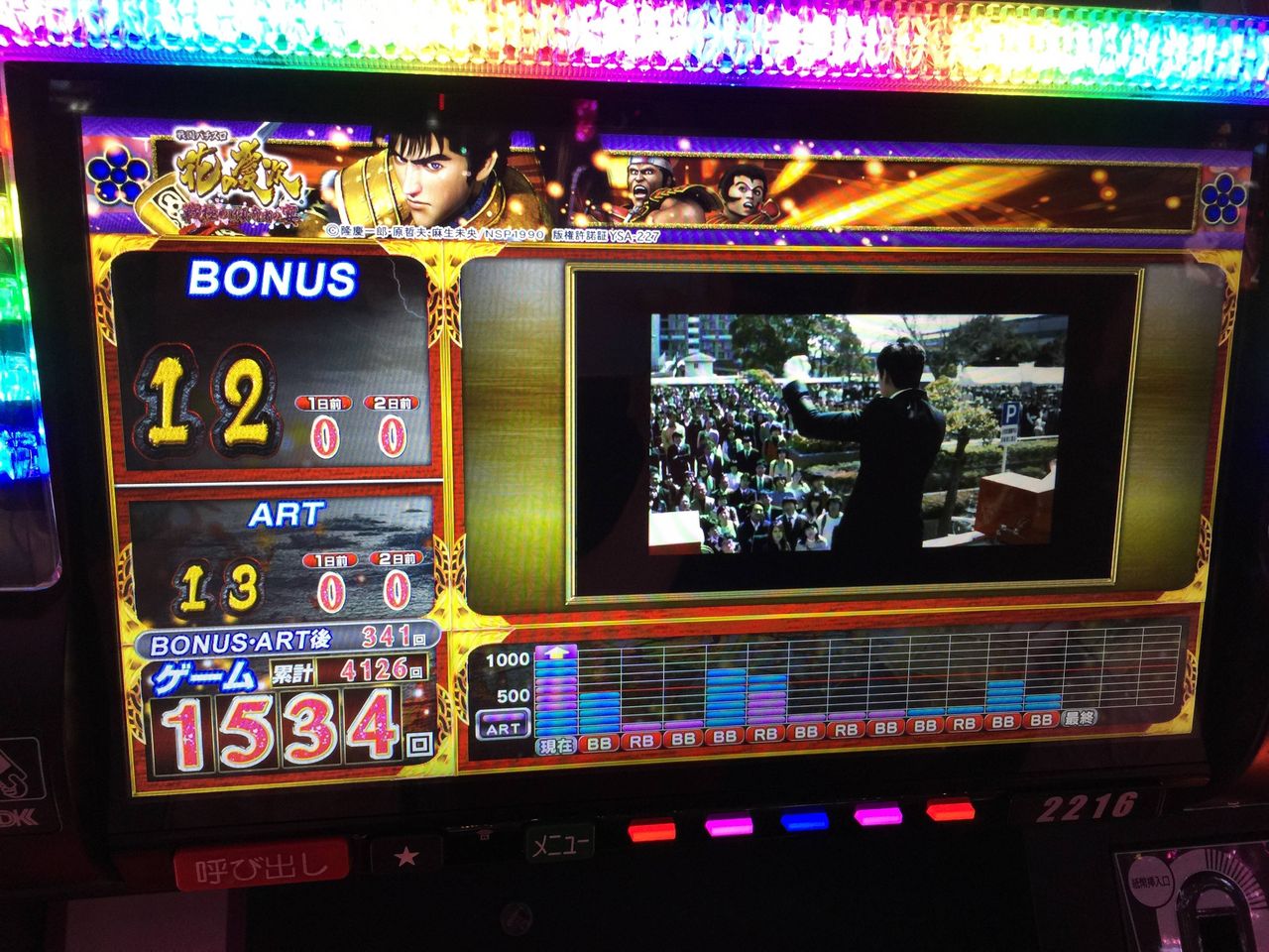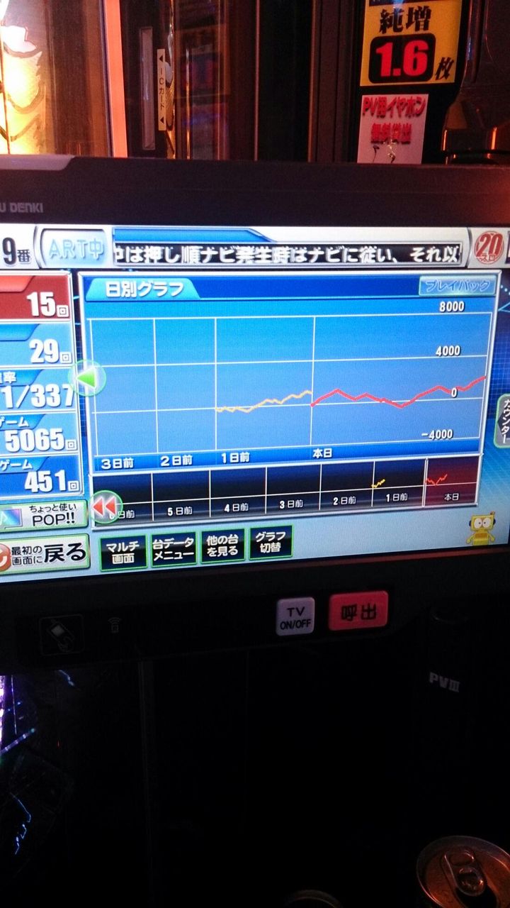 ART開始後すぐに青7狙えで揃って天武に行って1400乗せ、そのすぐ後に弱チェから城門突破に行って成功して天武で1200乗せてウキウキだったけど、至福の時はその瞬間だけで、その後ほとんど上乗せしないわボナが2200嵌るわでただただ苦行だった…