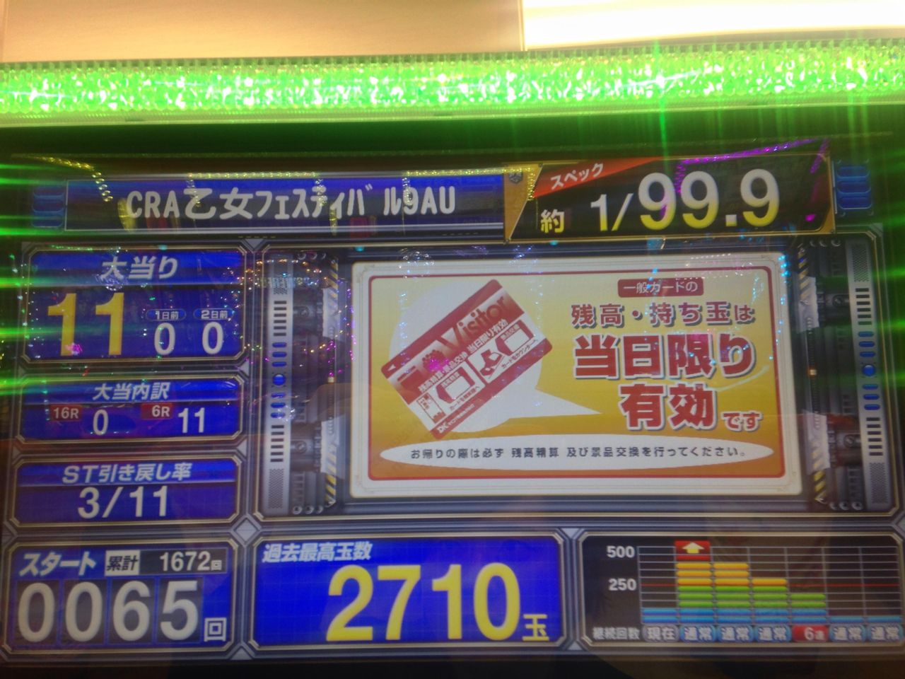 最初の当たりで保留連して「おいおいこれヘソだけど大丈夫か?」と思ったら無事に乙フェスモード入って一安心