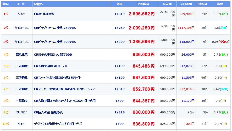 北斗無双の中古値段がなんと250万を超えてきました!そしてまだ上昇中なのでどこまでいくのやら・・・といったところ。元々新基準機の中では唯一と言っていいほど稼動する機種だったらしく、中古価格も上がり調子でしたけど、ここ数日の