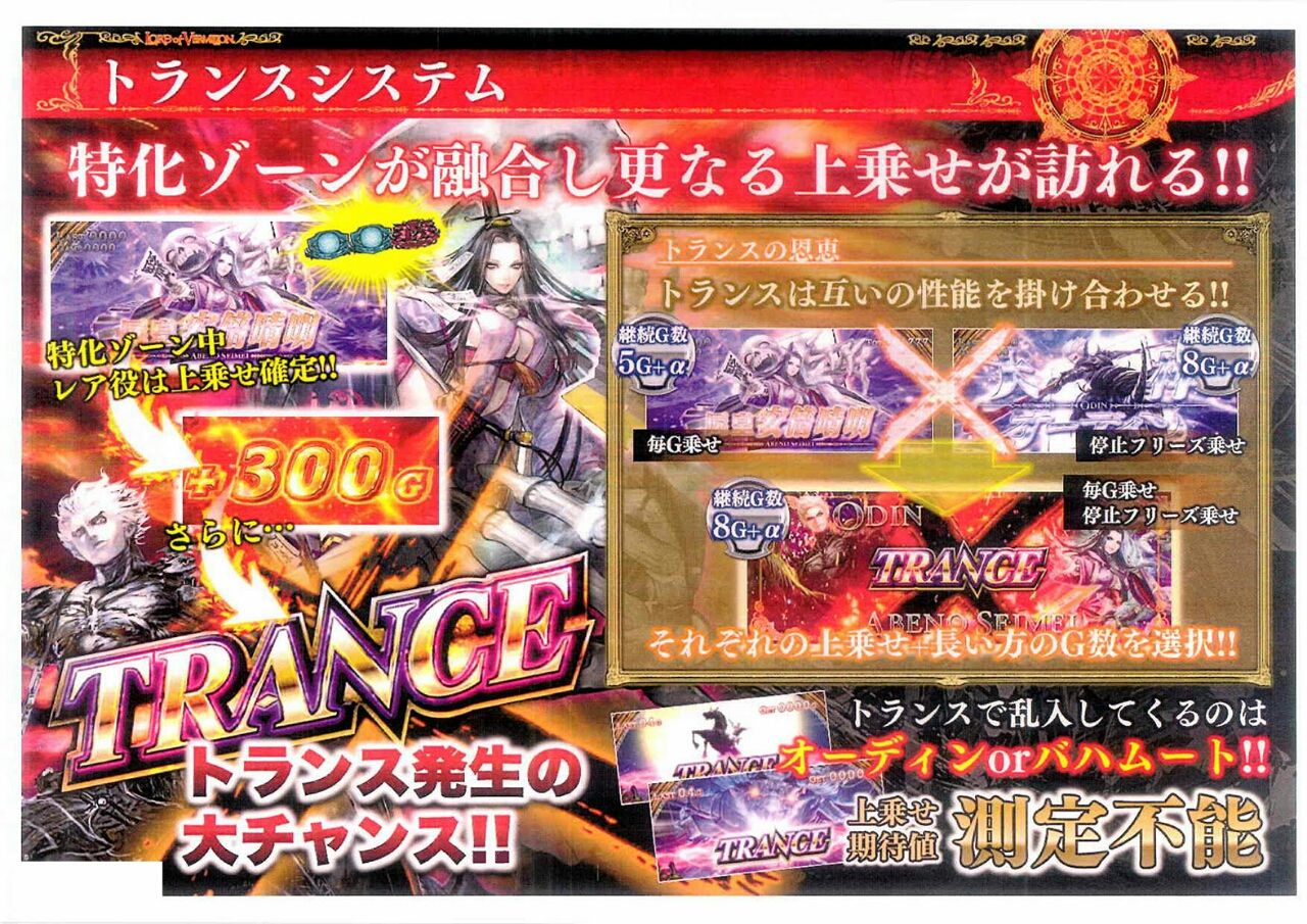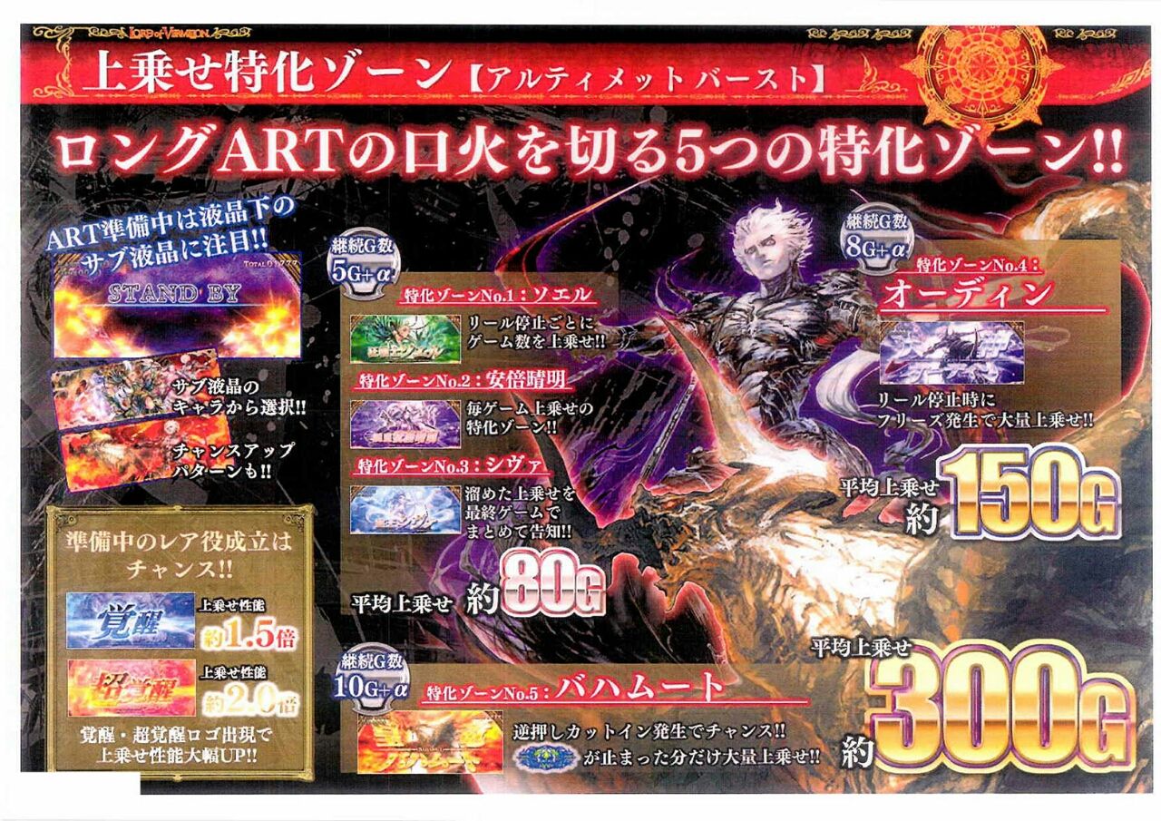 【画像】七匠「SLOTロードオブヴァーミリオン」演出資料(8枚)!!出玉率,皇帝確率,特化ZONE,マナシステムまで!! 2016年08月10日 カテゴリ:ニュース スポンサーリンク 七匠「パチスロロードオブヴァーミリオン」の資料画像が公開されました。いきなり詳しいのきましたーhttp://surokan-matome.blog.jp/archives/9250740.htmlなんというか・・・七匠版アナザーゴッドハーデスですね(笑)トライブチャンスはヘルゾーン、ART初期ゲーム数はアルティメットバーストと言う名のジャッジメントで決定、プレミアは1/8192でGOD図柄ならぬ皇帝図柄揃い、その恩恵は100G+特化ゾーン3個などなど・・・w スポンサーリンク タグ :#スロットロードオブヴァーミリオン#パチスロスペック#スロットスペック 「ニュース」カテゴリの最新記事 スポンサーリンク コメント コメント一覧 (5) 5. 名無しのドキュメンタリスト 2016年08月11日 07:01 これは完全に純増を下げたハーデスやなw 4. 名無しのドキュメンタリスト 2016年08月10日 13:49 まあ、ゲームのほうもオリジナリティをぶん投げた作品だし。 3. 名無しのドキュメンタリスト 2016年08月10日 13:22 これに近いものをポセイドンでやって機械割もうちょい上げれば大ヒット間違いなしなんだけどなぁ 2. 名無しのドキュメンタリスト 2016年08月10日 12:42 出さんでいい 1. 名無しのドキュメンタリスト 2016年08月10日 12:24 ハーデスあるんでいいです コメントする コメントフォーム 名前 コメント 評価する リセット リセット 顔 星 投稿する 情報を記憶