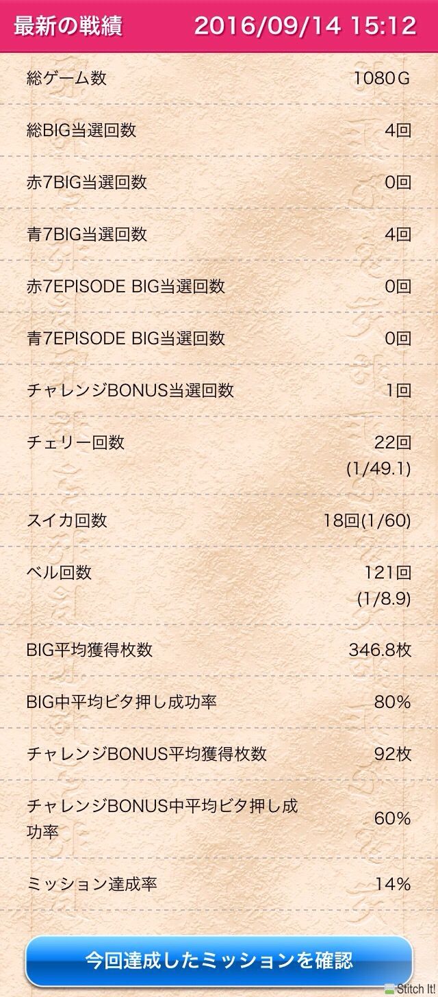 ・BIG中平均ビタ押し成功率 : 70 %