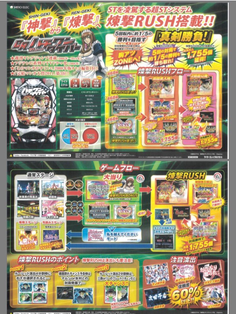 スペックが判明したCRハチワンダイバーのゲームフロー画像が公開されています。ウリの煉撃ラッシュは突入時は勝利確定の胸アツゾーンへ以降、そこで大当たりして以降は電サポ5回転で5回の対局があるようです。そよ群予告等、演出関係の情報もありますねー。それにしても「ぼくもですBONUS」って凄い名前だな・・・