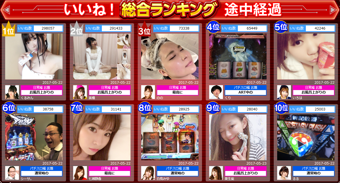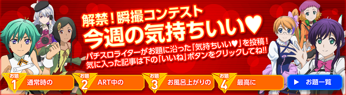 三共さんお馴染みの大型イベントが始まりましたねー。前回は「涼宮ハルヒの激写」でしたが、今回は「解禁!瞬撮コンテスト~パチスロライター禁断の気持ちいい~」となります。各お題に沿った写メを有名ライターさんたちがUPし、”いいね”数を競う形は変わりませんが・・・参加されるライター数が増え、より大型イベントになった感じでしょうか。