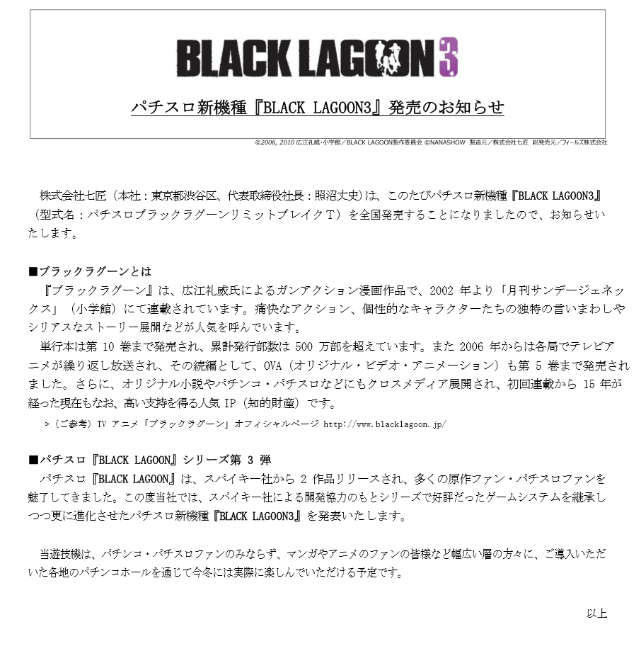 七匠「SLOTブラックラグーン3」発売を正式発表!スパイキー開発協力!! 2017年10月06日 カテゴリ:ニュース スポンサーリンク シリーズのゲーム性を継承、進化! http://777.nifty.com/report/uwasa/151020212922/ 七匠がパチスロ「BLACK LAGOON3」の発売を発表しました。前二作品をリリースした”スパイキー社”の開発協力で『好評だったゲームシステムを継承し、進化させた』とのことです。 スポンサーリンク タグ :#スロットブラックラグーン3 「ニュース」カテゴリの最新記事 スポンサーリンク コメント コメント一覧 (3) 3. 名無しのドキュメンタリスト 2017年10月07日 00:52 七匠はマジでセンス無いからな… スパイキーが七匠に協力するんじゃなくて 七匠がスパイキーに金と場所の提供だけして一切口出さなければいいよ 2. 名無しのドキュメンタリスト 2017年10月06日 23:56 七匠はもうパチスロ作るなよ… 1. 名無しのドキュメンタリスト 2017年10月06日 18:11 進化=ゲーム数長くしてめんどさくするだけ チャンスゾーンで使ったコインすらペイ出来ないartもどきはもう勘弁してくれ コメントする コメントフォーム 名前 コメント 評価する リセット リセット 顔 星 投稿する 情報を記憶