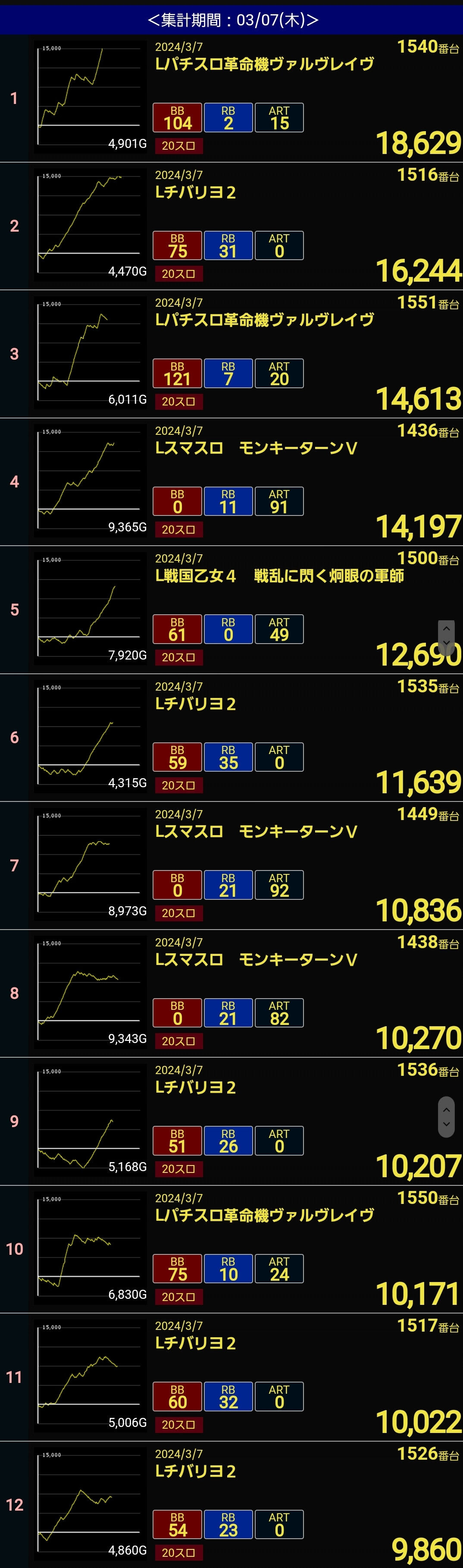 多分ちょいちょい離席してると思うけど9:45の初当たりから始まって最後の当りが19:32
