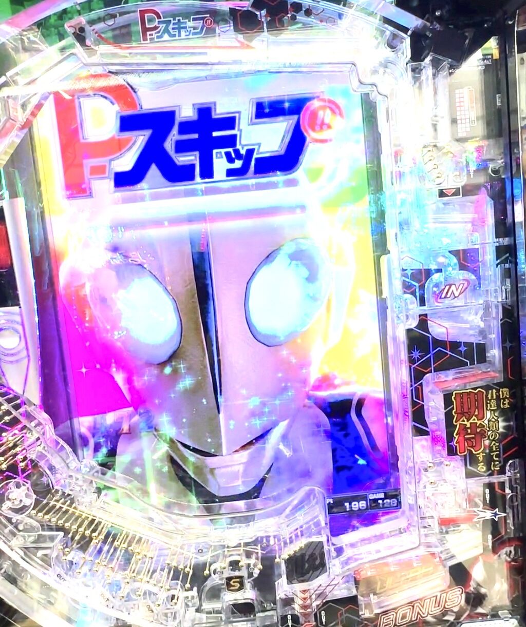 P-スキップは変動のどのタイミングでも使えるため、1図柄テンパイ(SPSPリーチ発展で超激アツ)時に赤背景のウルトラマン告知あおり発生で信頼度激高