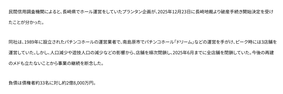 長崎県でパチンコ店を運営していた「プランタン企画」が破産 2026年01月23日 カテゴリ:ニュース スポンサーリンク https://www.yugitsushin.jp/news/hall/ もうすでにお店はなくなっていた法人ですが、正式にホール運営から撤退ということになりますね。 スポンサーリンク 「ニュース」カテゴリの最新記事 スポンサーリンク コメント コメント一覧 (1) 1. 名無しのドキュメンタリスト 2026年01月23日 20:35 モナコグループに怒られないといいね コメントする コメントフォーム 名前 コメント 評価する リセット リセット 顔 星 投稿する 情報を記憶
